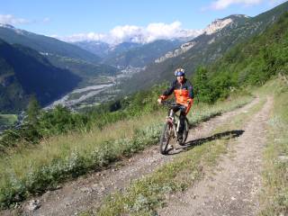 Descrizione: dal piazzale parcheggio del forte imbocchiamo la strada che porta ad Exilles (0 km). Attraversare tutto l'abitato percorrendo la via Roma (interessante la parrocchiale dedicata a S. Pietro Apostolo). Superato il rio Galambro, si ignorano le due deviazioni sulla sinistra che portano rispettivamente alla stazione (0,82) e a Champbons (1,35). Seguendo la SP213 si raggiunge la SS24 (2,14) che si percorre in direzione Salbertrand. Dopo due tornanti, deviare sulla SP256 per Fenil (3,88). Lasciata sulla destra la diramazione che porta alla borgata (4,83) si oltrepassa l'omonimo forte. Poco oltre si lascia la direzione Pramand prendendo a destra per Eclause (5,83). Poco prima della frazione, tenere la sinistra (7,12 - indicazioni Grange della Valle). Giunti nei pressi del "pozzo Eclause" imboccare la sterrata sulla sinistra (7,81) che in poco meno di 5 km porta alla Gr. Hubert. Prima di quest'ultima, tenere la stradina a monte (12,43) che termina dopo qualche centinaio di metri con uno splendido balcone panoramico (12,64). Rientro lungo la strada della salita ma transitando per la borgata Eclause ovvero imboccando a sinistra la carrareccia del "sentiero balcone" (17,92) che diventa più avanti via Case Garde. Presso una fontana (18,17) si svolta due volte a destra lungo la via Salbertrand. Lasciate le case alle spalle si confluisce sulla strada della salita (18,38). Occorre ora ritornare alla SS24 e raggiungere Salbertrand (esiste la possibilita di scendere direttamente a quest'ultima località percorrendo un sentiero molto tecnico contrassegnato con il numero 12 che si incontra poco dopo il bivio per il Pramand - il mio consiglio è comunque quello di seguire l'asfalto). Giunti a Salbertrand si svolta subito a sx lungo la via Fulvio Arlaud (24,22) e quindi, andando diritto, si supera la ferrovia e, dopo il ponte sulla Dora Riparia, si va ancora diritto per viale Europa (24,45). Usciti dallo stretto tunnel sotto l'autostrada Torino-Bardonecchia (24,77) si va a sinistra. Attenzione poi a tenere il sentiero parallelo alla strada (25,19 - dx) che consente di arrivare direttamente alla sterrata che porta a Sapé d'Exilles (25,37). Superata quest'ultima, inizia la discesa che ci porterà ad affrontare una serie di tornanti. Non attraversare poi la Dora ma seguire a destra la sterrata per Autre Doire (31,28). Si arriva così alla diramazione della SP213 che porta alla stazione (32,24). Seguirla in discesa, attraversare due volte il rio Baccon e poi il ponte sulla Dora Riparia. Risalire alla SP213 e a dx (33,32) rientrare al parcheggio del forte.